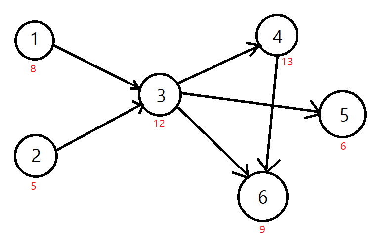 그래서 위 그래프에서 노드 1과 노드 2 중 건설 시간이 더 큰 노드 1의 건설만 완료되면 노드 3을 건설할 수 있는 것이다.