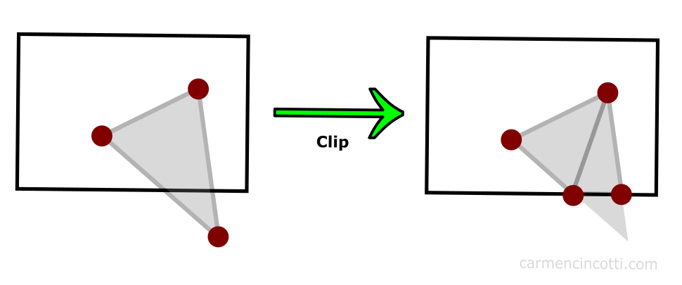 Clip은 GPU에서 알고리즘을 통해 적절하게 Primitive를 분리하여 볼륨을 벗어난 부분을 제거하는 것입니다. 반면 Culling은 Primitive가 아닌 Object를 제거하는 것입니다. Clip 이후에는 저렇게 새로운 정점들이 생긴 것을 볼 수 있습니다.